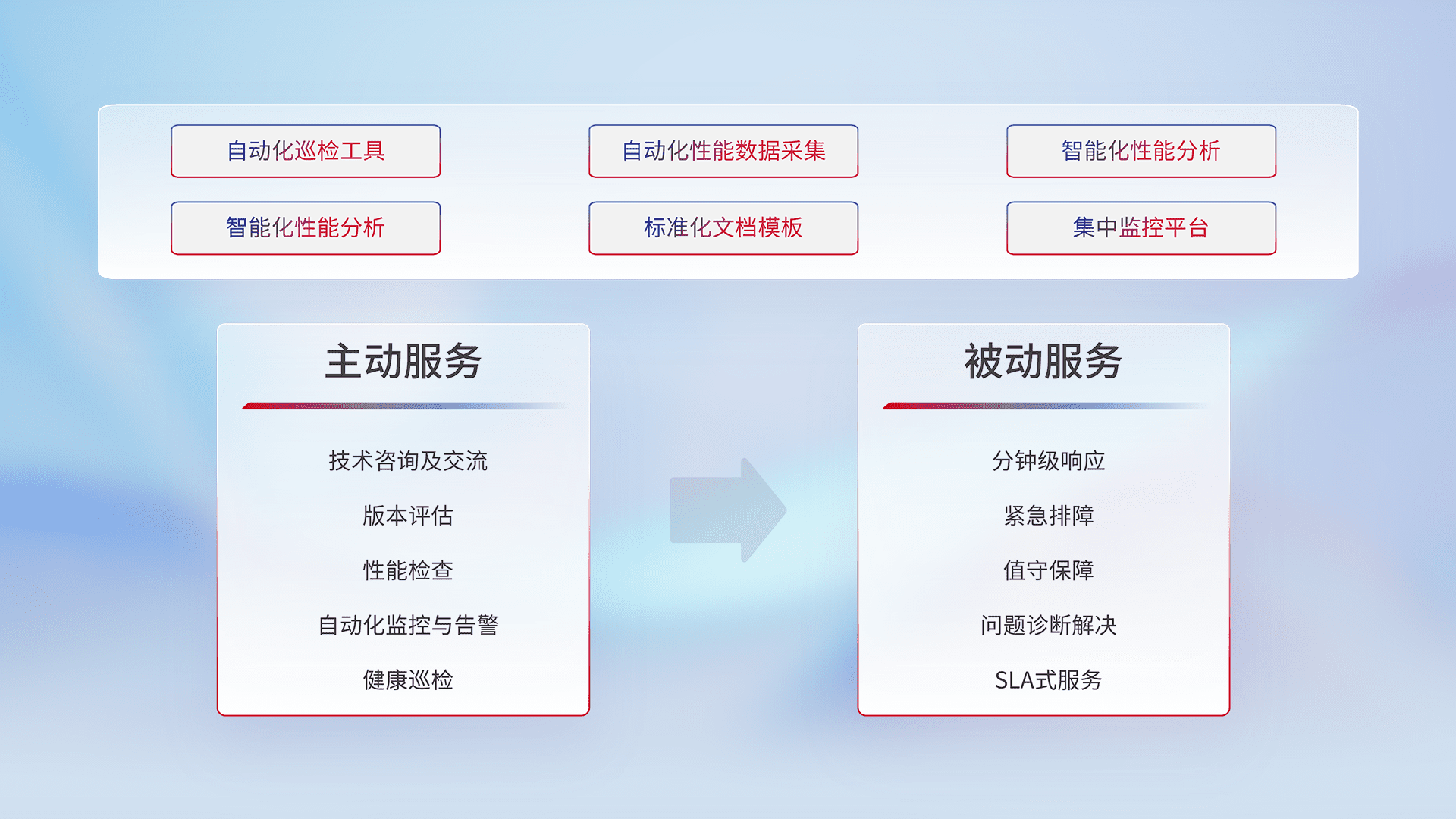 智能化工具和标准化文档,,,,保障服务质量,,,提供主动服务(包含技术咨询、、版本评估、、性能检查、、自动化监控与告警、、、健康巡检)和被动服务包含(分钟级响应、、、紧急排障、、、值守保障、、、、问题诊断解决、、SLA服务)。。。